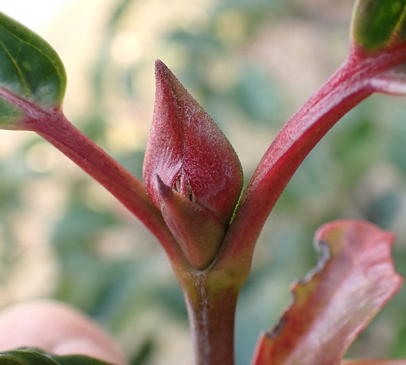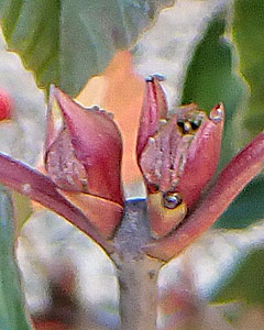 サンゴジュ・鱗芽 対生 長さ8〜17ミリ 芽鱗は2〜3対ある。 ・葉痕は半円形 ・維管束痕は3個 |